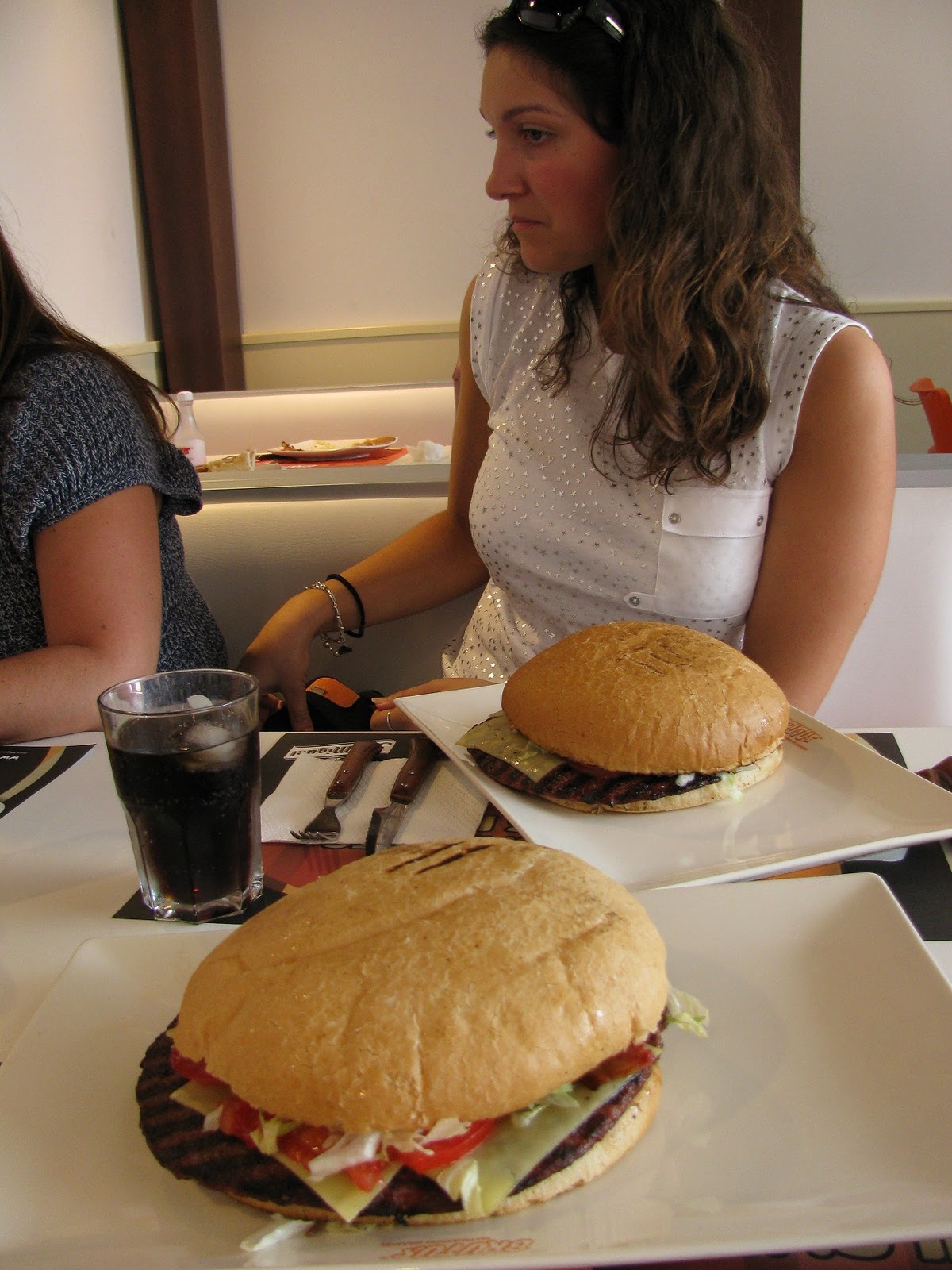 En cuanto a la comida esta bastante bien y para que os hagáis una idea una hamburguesa mide sobre unos 23 cm. de diámetro, así que se supone que es para compartir (y digo "supone" porque siempre habrá alguno que se la "zampe" el solito), un sandwich y un perrito de 40 cm. de largo y así toda la comida, a lo bestia.