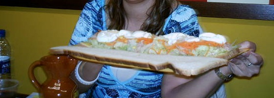 En cuanto a la comida esta bastante bien y para que os hagáis una idea una hamburguesa mide sobre unos 23 cm. de diámetro, así que se supone que es para compartir (y digo "supone" porque siempre habrá alguno que se la "zampe" el solito), un sandwich y un perrito de 40 cm. de largo y así toda la comida, a lo bestia.
